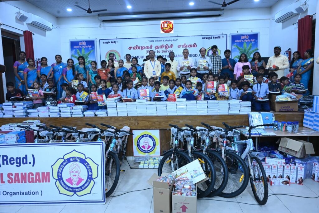 उन्होंने आगे बताया कि कार्यक्रम के अंतर्गत बच्चों को 25 साइकल्स, 300 स्कूल बैग्स, 650 नोट बुक्स, 650 बुक्स तथा 650 स्टेशनरी आइटम्स और 200 शूज( जूते) वितरित किए गए। जिससे उन्हें आत्मविश्वास एवं प्रेरणा के साथ अपनी शिक्षा जारी रखने के लिए प्रोत्साहन मिलेगा। मुख्य अतिथि जे एम बालामुरुगन ने कहा कि चंडीगढ़ तमिल संगम समाज के लिए एक नेक कार्य कर रहा है। उन्होंने “विद्या दानं” पहल के माध्यम से वंचित बच्चों में शिक्षा को बढ़ावा देने के प्रयासों की सराहना की। उन्होंने कहा कि आर्थिक रूप से वंचित पृष्ठभूमि के बच्चों की शिक्षा का समर्थन करके राष्ट्र निर्माण के प्रति आपके समर्पण को देखकर बहुत खुशी होती है।